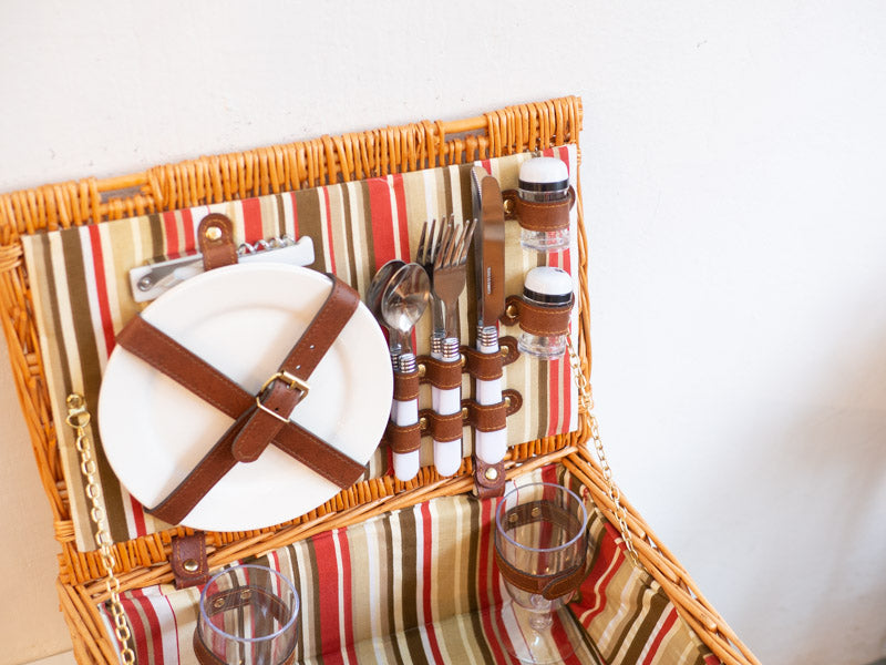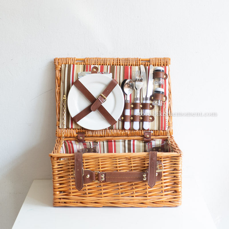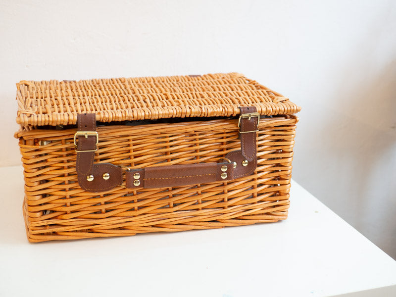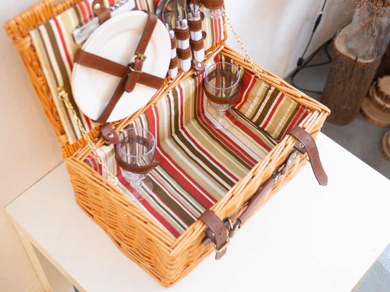 英倫風格的復古野餐藍,用柚木色的藤手織而成,內籠有花布裝飾,方便盛載食物。附有2人分量的餐具、酒杯、碟以及保溫袋。外邊則有皮革的手抽位。全人手編織,手工非常精緻。