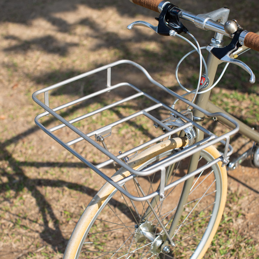 不鏽鋼製成的前籃,復古而簡潔的設計但非常堅固耐用。每個都是人手焊接,而管身是空心的,因此十分輕量。此貨架採用了202不鏽鋼為材料,相比之下304不鏽鋼版本會更加耐用,尤其是對潮濕的天氣壽命更久。